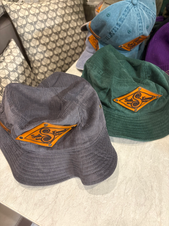 Fabric Ball Caps with adjustable back: light brown, light blue, turquoise, olive, light green (hard to see in the back right)